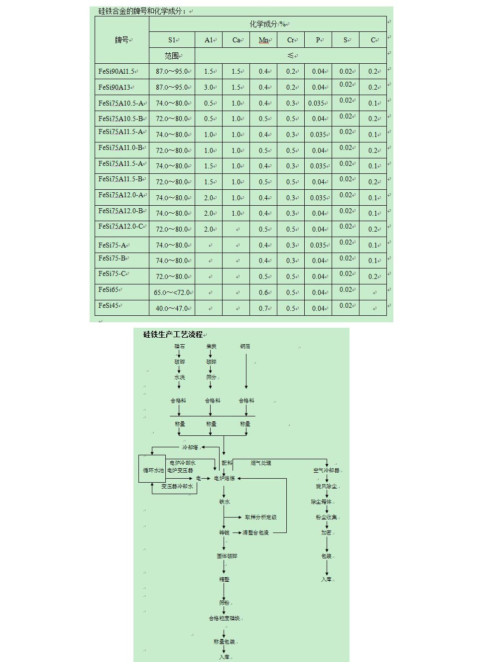 硅鐵是鐵和硅組成的鐵合金。 硅鐵是以焦炭、鋼屑、石英(或硅石)為原料,用電爐冶煉制成的鐵硅合金。由于硅和氧很容易化合成二氧化硅,所以硅鐵常用于煉鋼時(shí)作脫氧劑,同時(shí)由于SiO2生成時(shí)放出大量的熱,在脫氧的同時(shí),對(duì)提高鋼水溫度也是有利的。同時(shí),硅鐵還可作為合金元素加入劑,廣泛應(yīng)用于低合金結(jié)構(gòu)鋼、彈簧鋼、軸承鋼、耐熱鋼及電工硅鋼之中,硅鐵在鐵合金生產(chǎn)及化學(xué)工業(yè)中,常用作還原劑。硅鐵在鋼工業(yè)、鑄造工業(yè)及其他工業(yè)生產(chǎn)中被廣泛應(yīng)用。